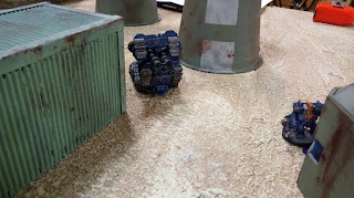 The table was pretty barren with a few rocky outcrops and a bunch of stuff strewn around the place. I got to use several new pieces of terrain that I put together during the week - The green huts and dark grey things (see below). I suppose they could be venting shafts or some such thing.