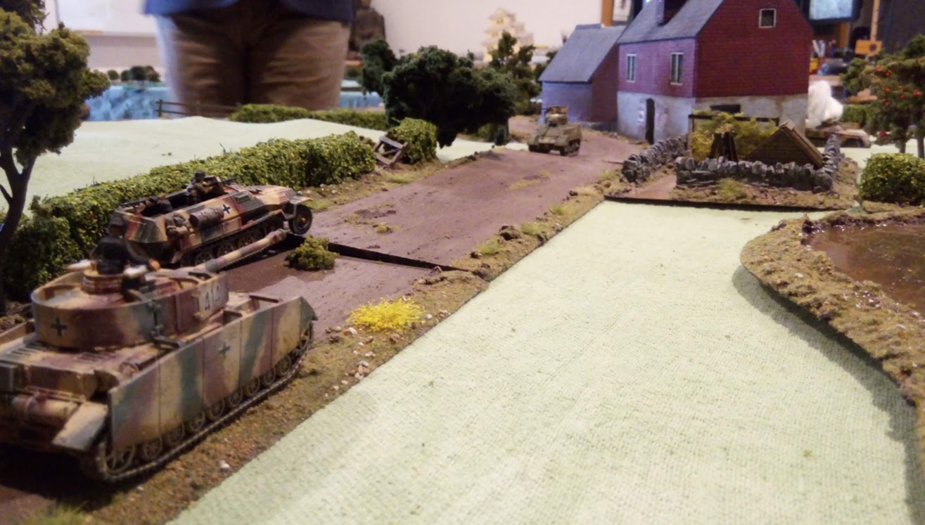 As this was happening the Firefly took up a commanding position in the center of the table covering the advance of one Cromwell in the center and the other Cromwell, with supporting infantry in an M5 halftrack making a flanking maneuver behind.