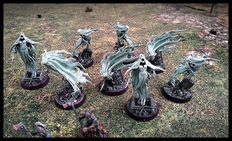 They're not bad figures but they do have a few issues as far as I'm concerned. First of all: they don't fit together very well. I had to drill their arm sockets to get a good fit with the arms. This was a pretty easy task but it was annoying. Secondly, there are two figures on each sprue without bases. These are supposed to be used as riders for the WgA giant spiders but it would have been nice to have a couple of bases added to the sprue. Third: there are not spears on the sprue. I used Oathmark spears cut off at the wrist and fixed them to some sword arms to make up numbers.